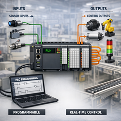 A Programmable Logic Controller (PLC) is a rugged industrial computer designed to control machines, processes, and automation systems with high reliability. PLCs are the backbone of modern manufacturing—from packaging lines and water treatment plants to oil & gas facilities and robotics.